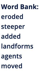Erosion is the process by which sediments are _______ or carried from one place to another. The 4 main causes or _______ of erosion are wind, water, ice and waves.