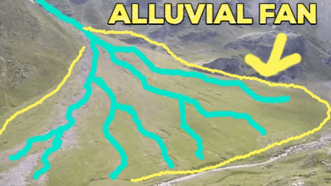 An alluvial fan is created when this stream flows into _______ . They are sometimes associated with flash floods. These fans typically form in mountain regions where there is a _______ change in slope from high to a gradual slope. When the land flattens out, the flow of water _______ energy and deposits sediment in a fan-shape.