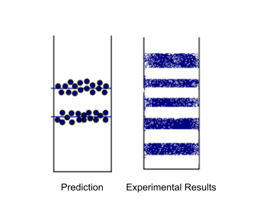 In the double slit experiment, light was shone through two slits and the pattern that the light created was observed on a screen. Scientists predicted to see two bright bands as shown in the left image. The experimental results are shown on the right image.