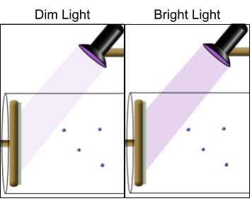The image above shows a dim and bright purple light shining on calcium. The purple light shown in each scenario has a frequency that is above the threshold frequency for calcium.