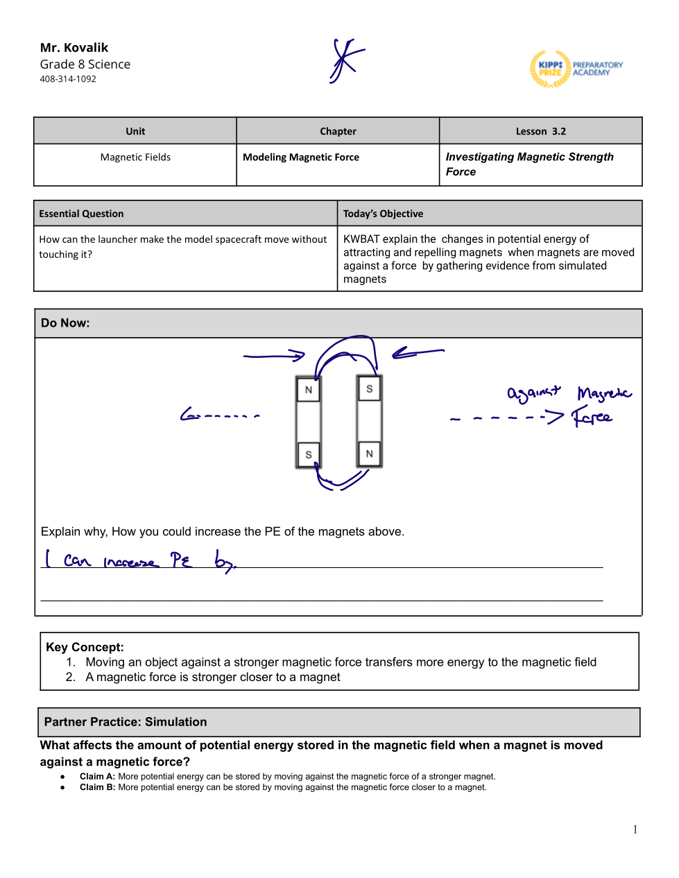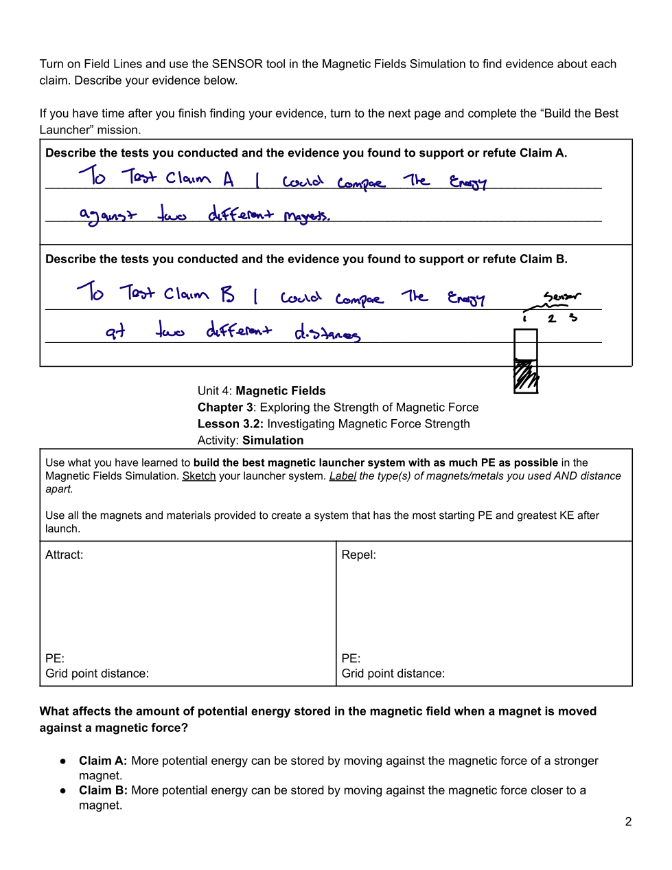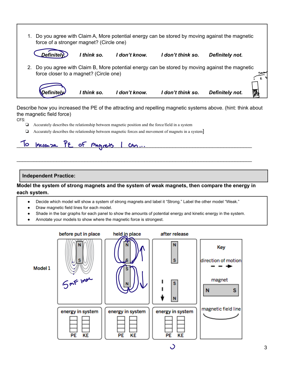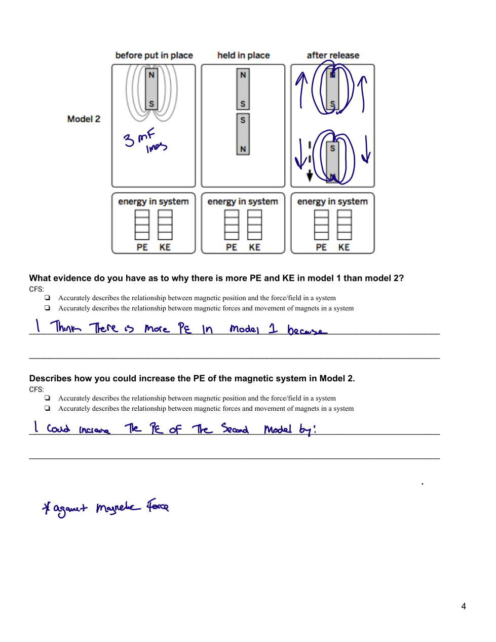 Describe how PE changes in the three phases. AND how it is diffrent from model 1. (hint, there are less magnetic field lines. how does this impact PE?)