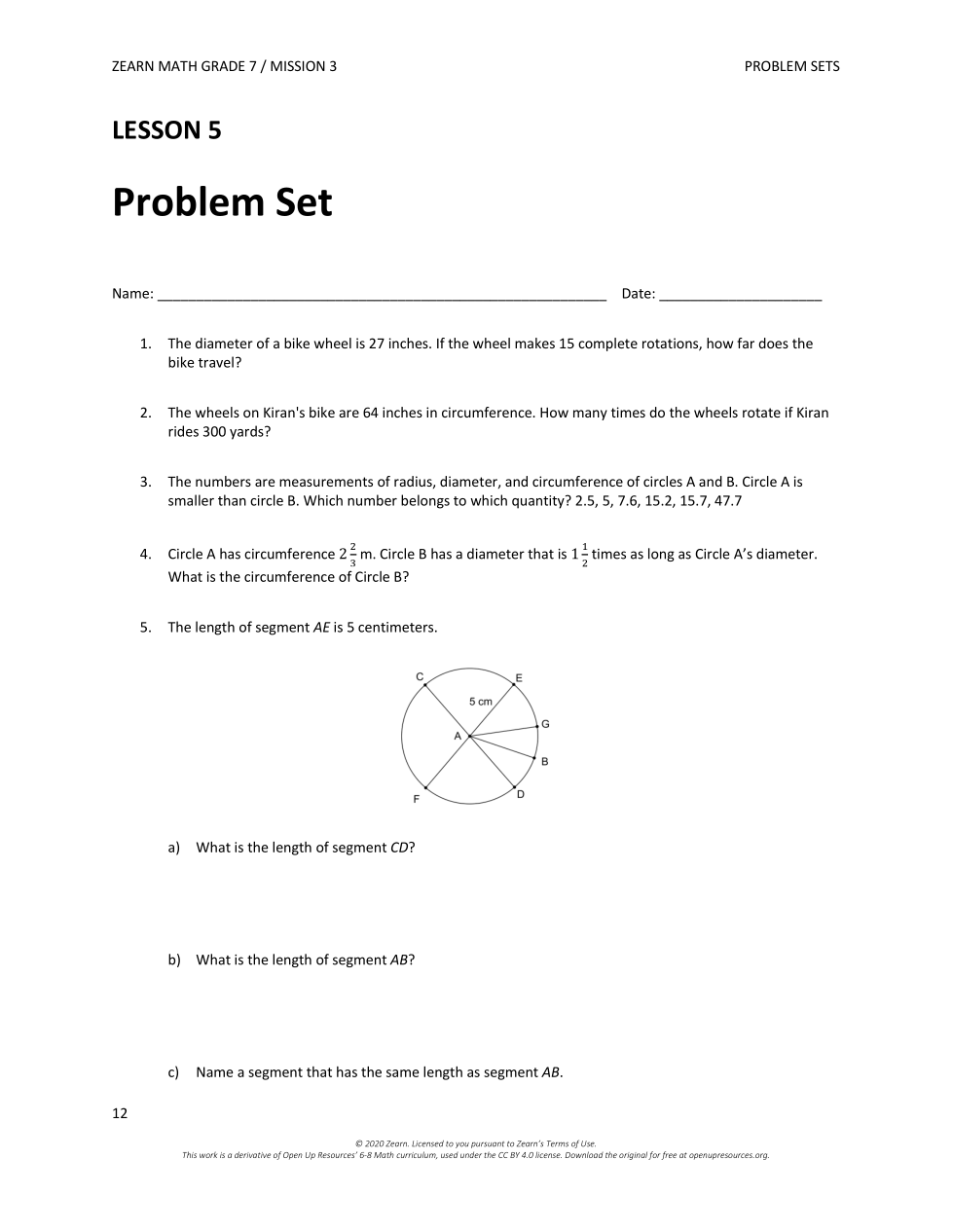 1. The diameter of a bike wheel is 27 inches. If the wheel makes 15 complete rotations, how far does the bike travel?