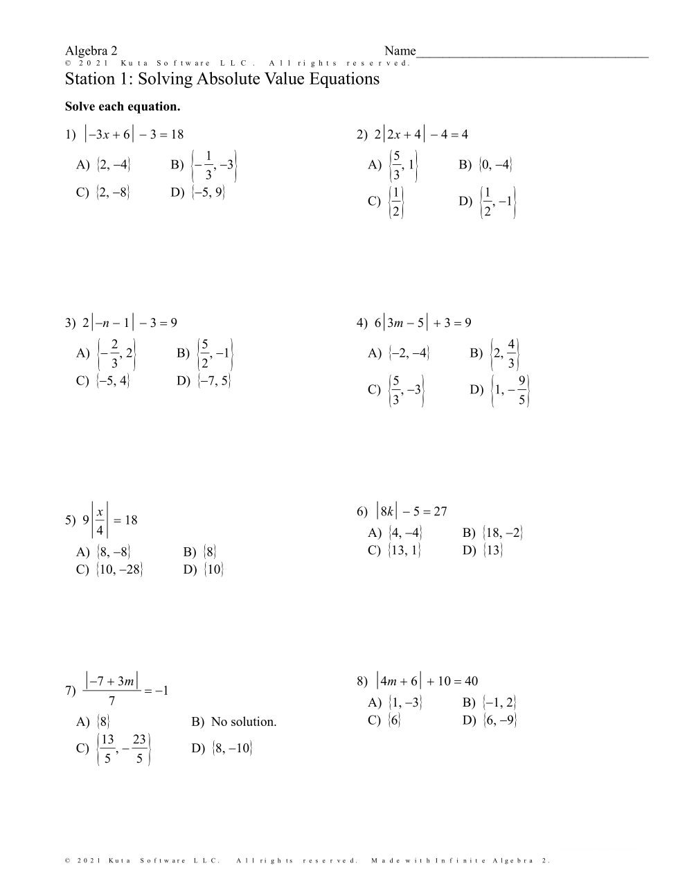 Station 1: Solving Absolute Value Equations