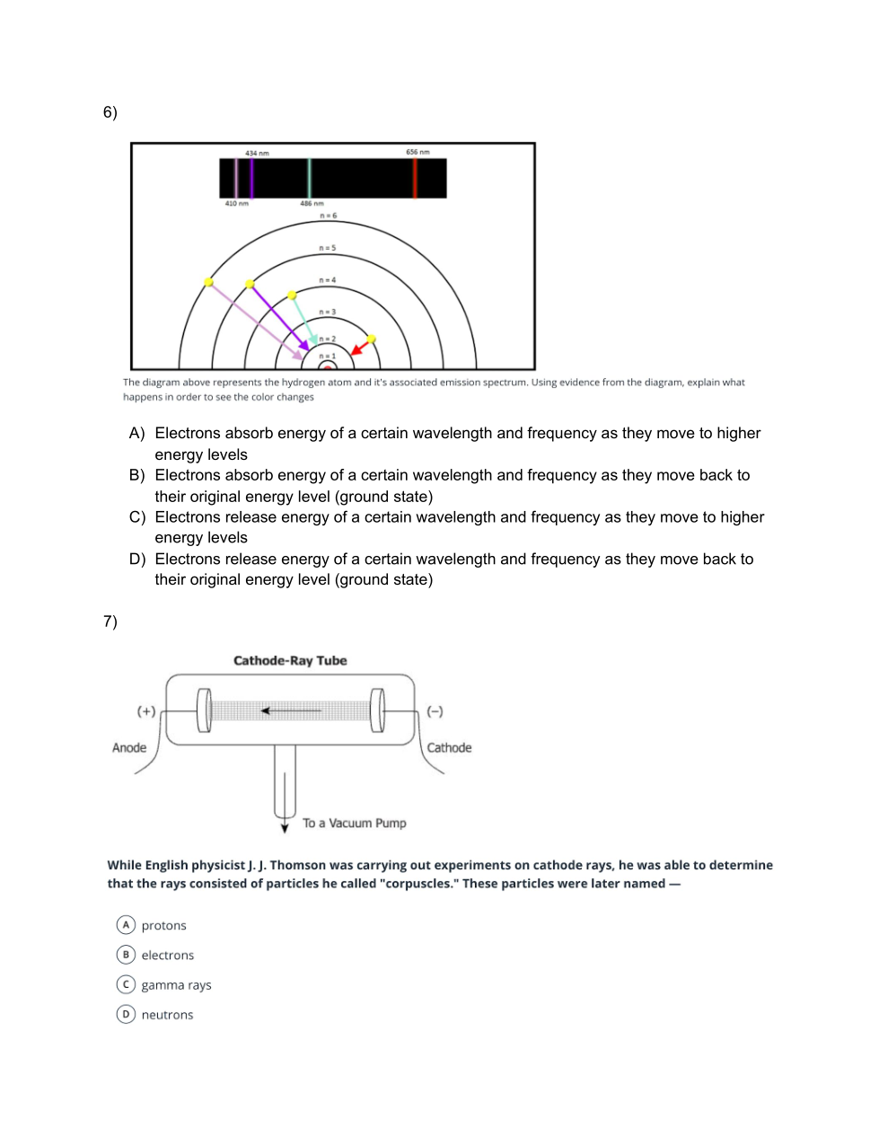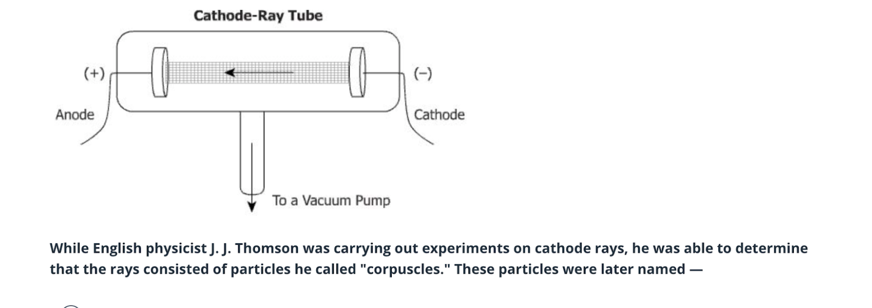 While English phsysicist J.J. Thomson was carrying out experiments on cahtode rays, he was able to determine that the rays consisted of particles he called "corpuscles." These particles were later named___________