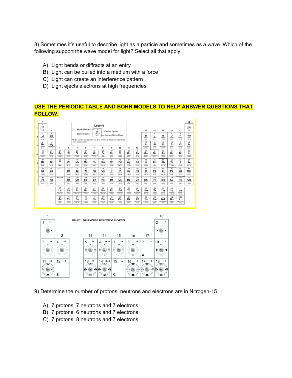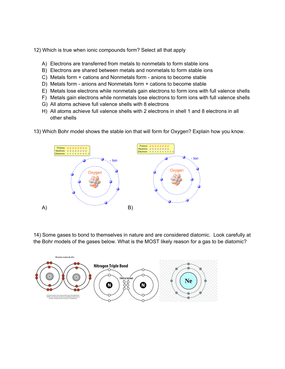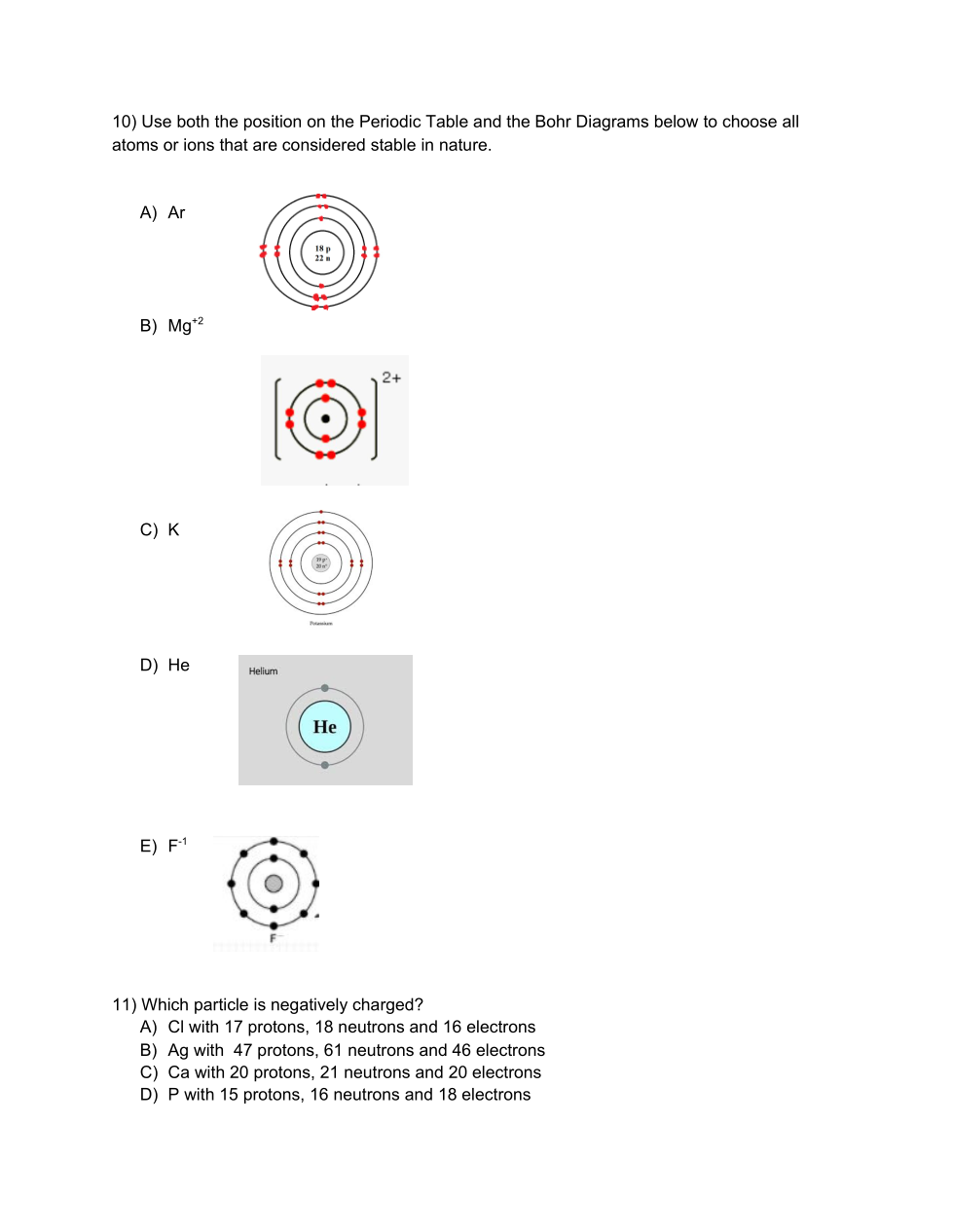 Use both the position on the Periodic Table and the Bohr Diagrams below to choose all atoms or ions that are considered stable in nature.