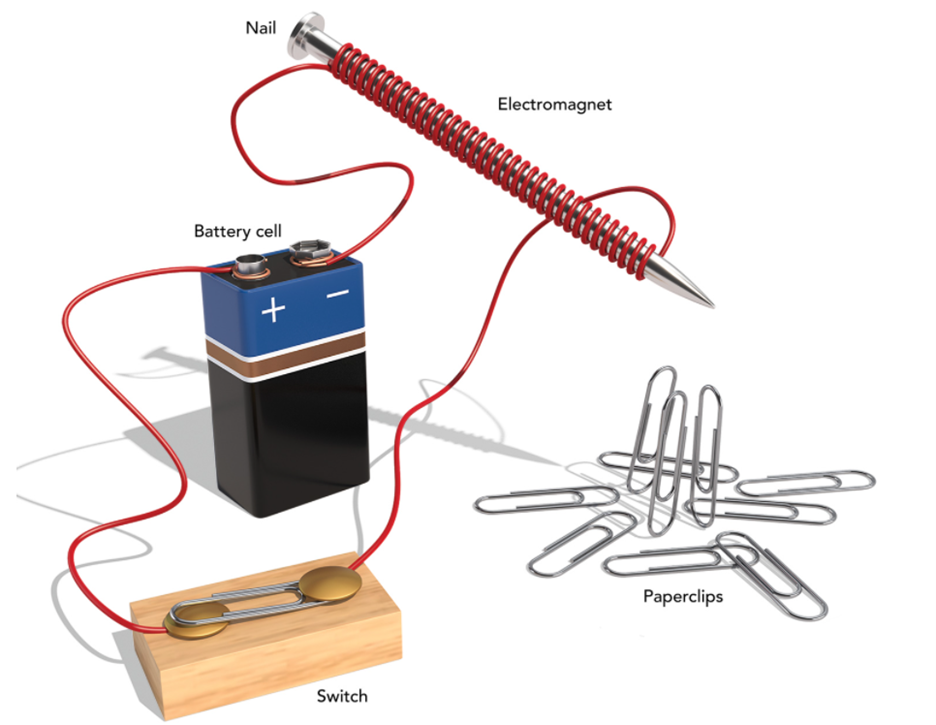 The electromagnetic force of the electromagnet (attracts / repels) the paper clips. The paper clips move (toward / away from) the nail.