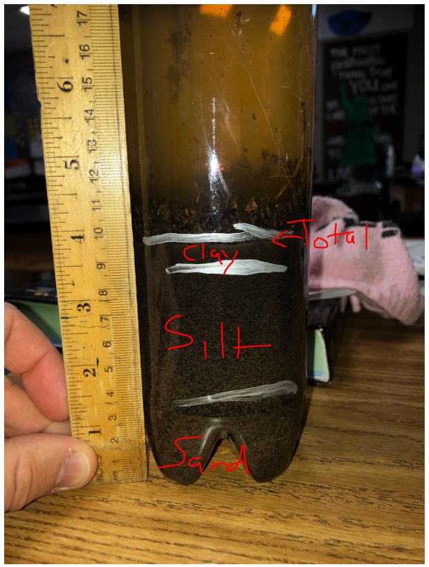 Using the picture below or the sample in class, it's time to determine the percentage of sand, silt, and clay relative to the total soil level. To calculate the percentage, divide the depth of each layer of soil by the total soil depth in the jar, and multiply by 100. (Use millimeters). Because sand is the biggest particle, it falls out first, silt is the second layer because its size is between sand and clay, and the top layer is clay because it is the smallest particle.