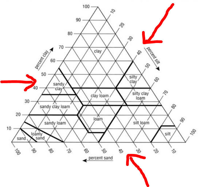 Using Mr. Beeler's sample above calculate the percentage for each type of soil (sand/silt/clay) and find its location on the soil texture triangle. Write the soil type below.