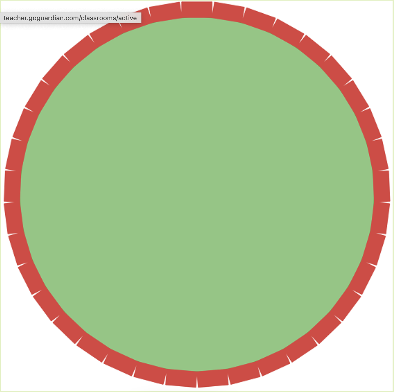A circular lawn has a row of bricks around the edge. The diameter of the lawn is about 40 feet.