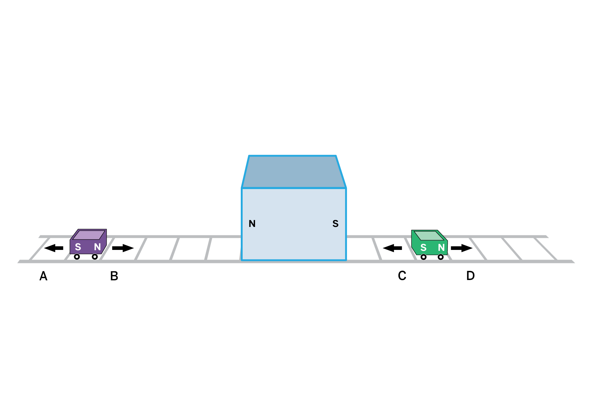 Jamal is playing with magnetic toy vehicles. He has two identical magnetic vehicles (purple and green) on different sides of a center magnet that cannot move. His friend Simone challenges him to move one vehicle one space to the left or the right in order to get the largest increase in potential energy. That means Jamal can move the purple car to point A or point B, or he can move the green car to point C or point D.