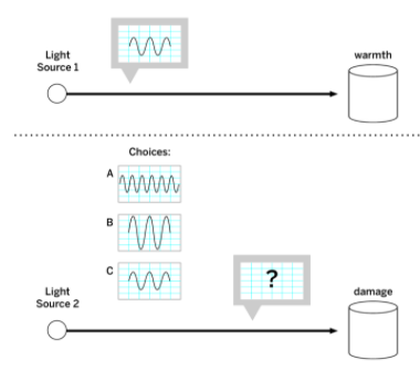 Examine the diagram below. Observe the waveform and effect for Light Source 1, and the effect for Light Source 2. Then, decide which waveform (A, B, or C) could represent the light emitted by Light Source 2. Consider the following questions to help you decide: