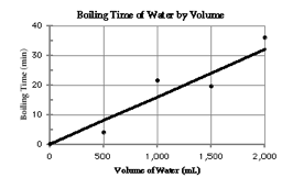 Use the graph to predict the boiling time of water that has a volume greater than 2,000 milliliters.