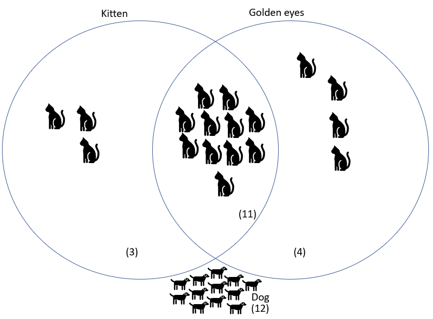 The Human Society has some cats and dogs available for adoption. Some cats are kittens and some cats have golden eyes. The numbers of each type of animal is given in the figure below.
