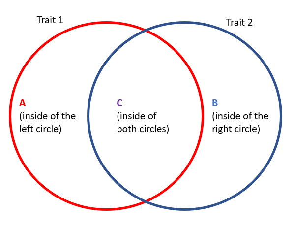 The figure below represents a population. The population can have trait 1, trait 2, or both.