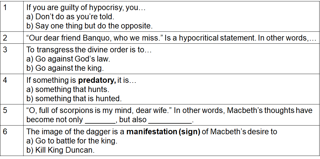 “O, full of scorpions is my mind, dear wife.” In other words, Macbeth’s thoughts have become not only _______, but also _______.