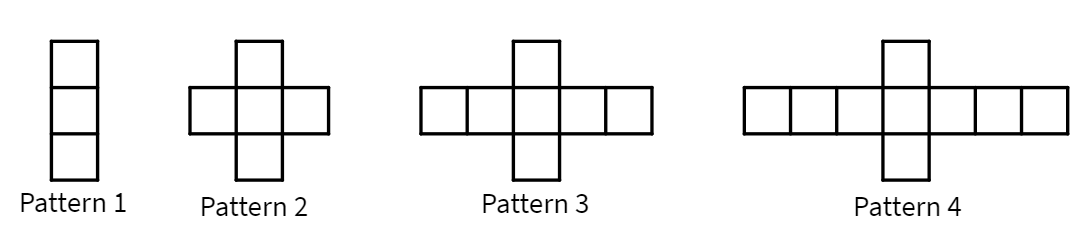 Sione said: I also noticed that the pattern was growing by two each time. I saw that Pattern 1 just has 3 blocks. Pattern 2 has 3 blocks plus 2 groups of 1 block on either side. Pattern 3 has 3 blocks plus 2 groups of 2 blocks. So, I wrote B = 2(n - 1) + 3.
