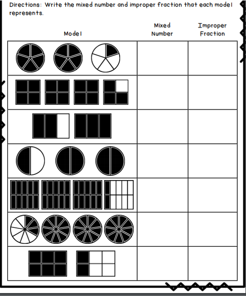 Write the mixed number and improper fraction that each number represents.