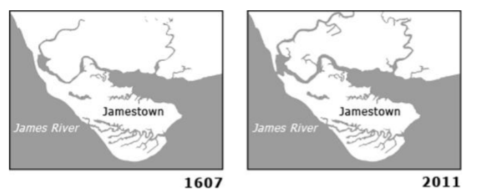Comparing these two maps, how is the geography of Jamestown today different from when the settlers arrived in 1607?