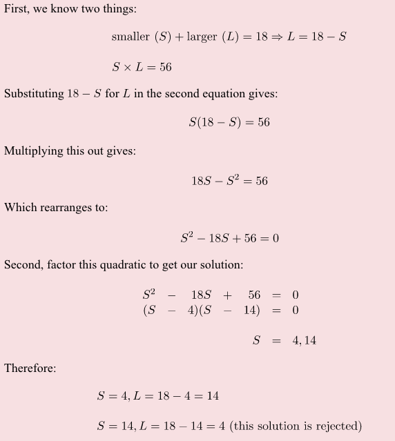 The sum of two numbers is 18, and the product of these two numbers is 56. What are the numbers?