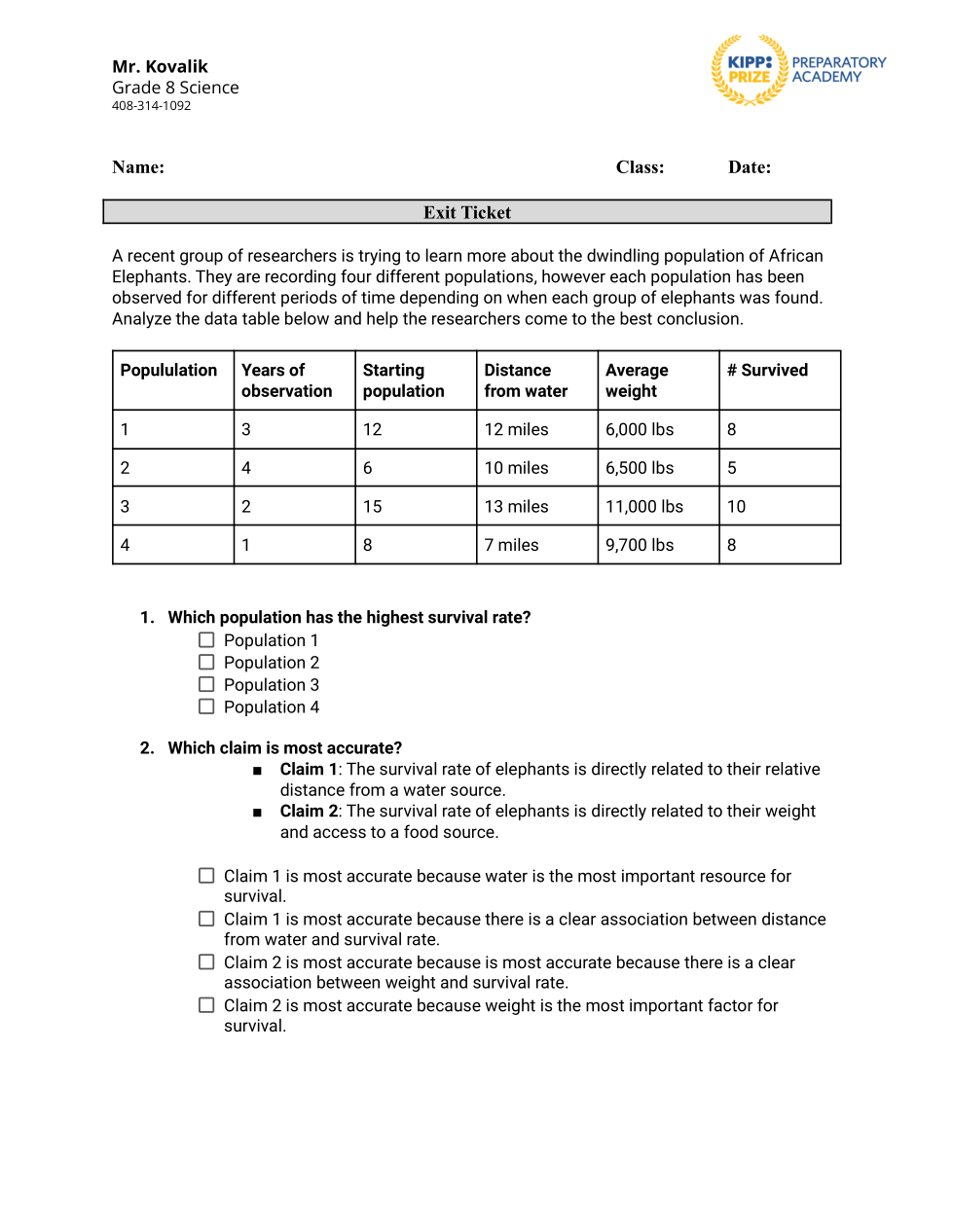 - Claim 2: The survival rate of elephants is directly related to their weight and access to a food source.