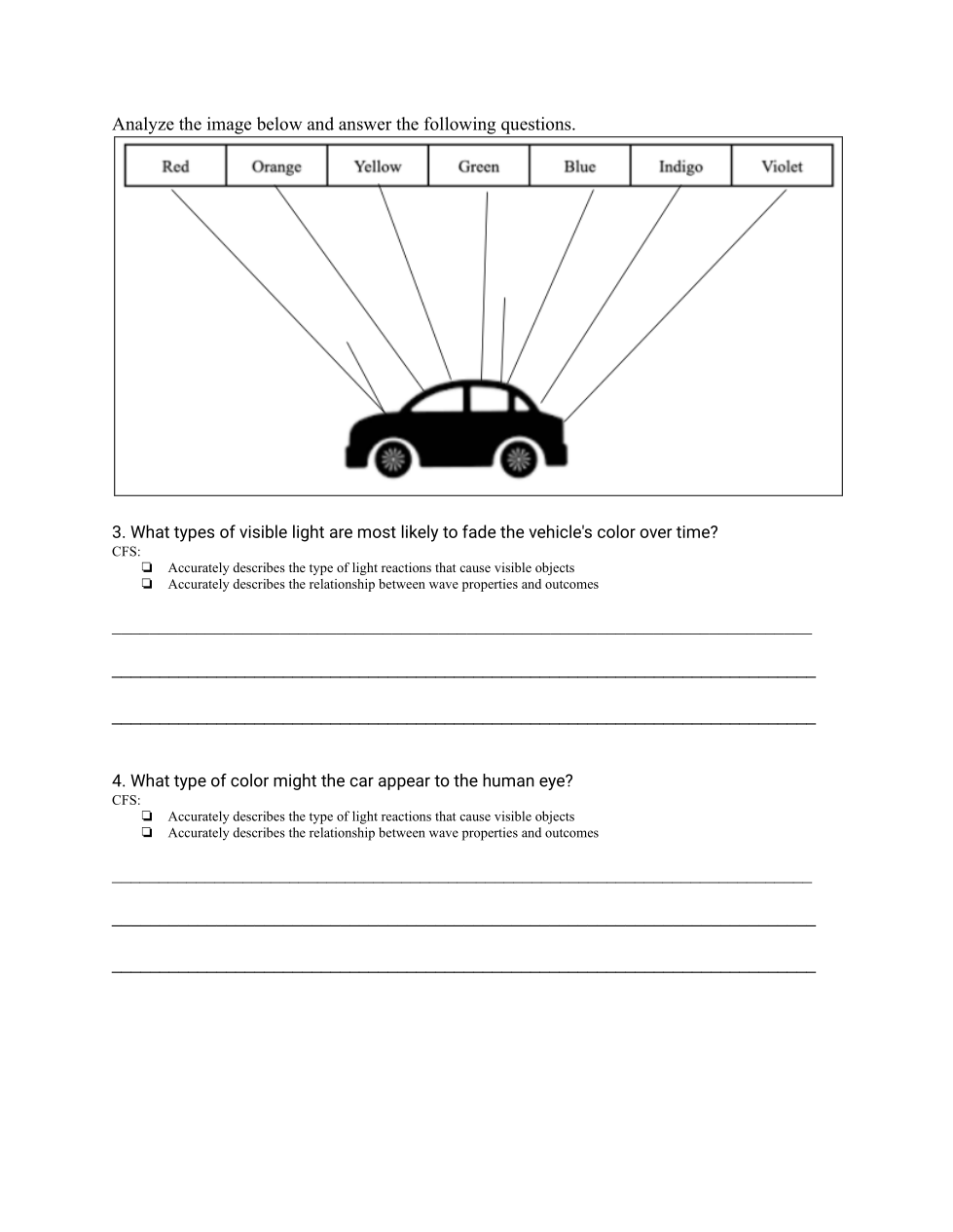 What types of visible light are most likely to fade (change) the vehicle's color over time?CFS:- Accurately describes the type of light reactions that cause visible objects