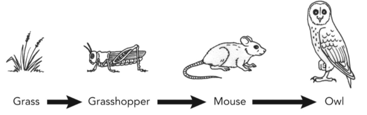 A __________chain is a convenient way to show how __________moves among living things in an __________ Here is an example of a food chain.