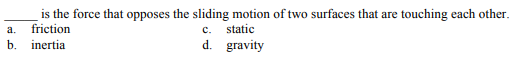 The force that is created when two surfaces rub against one another. | arrow_right_alt | Spring |