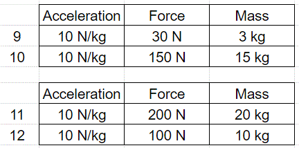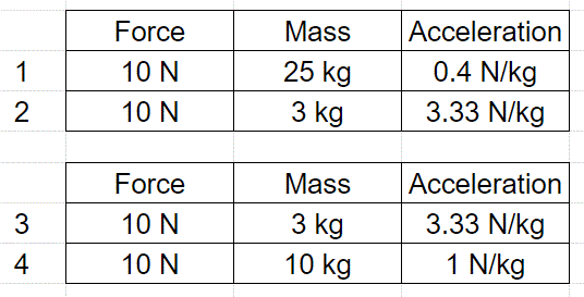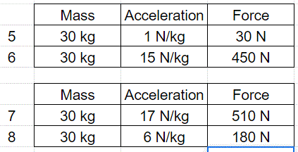 When the acceleration was__________from 1 N/kg to 15 N/kg, the force __________