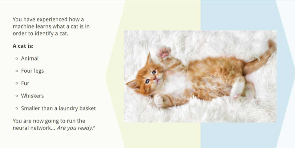 Imagine you are a machine and you are learning how to categorize objects in order to learn how to differentiate objects. Then, using what you have learned, you will apply that learning to see if you can correctly identify objects that are cats and not cats.