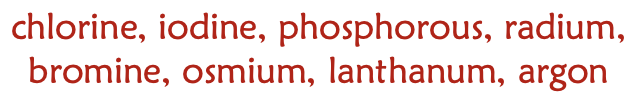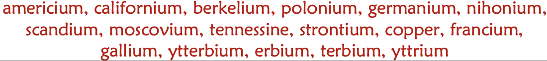 americium, californium, berkelium, polonium, germanium, nihonium, scandium, moscovium, tenessine, strontium, copper, francium, galium, ytterbium, erbium, terbium, yttrium
