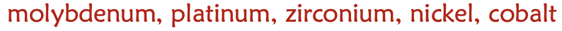 molybdenum, platinum, zirconium, nickel, cobalt