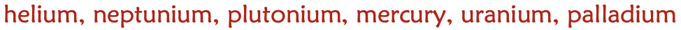 helium, neptunium, plutonium, mercury, uranium, palladium