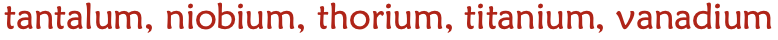 tantalum, niobium, thorium, titanium, vanadium