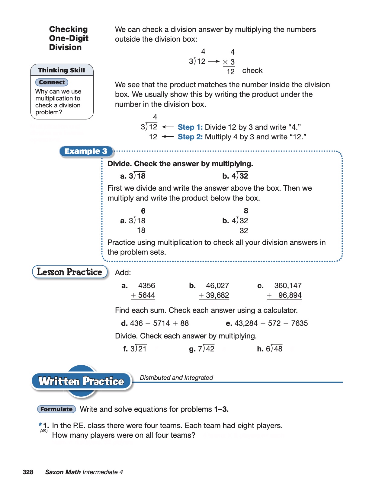 Question 1-In PE class there were four teams. Each team had eight players. How many players were on all four teams?