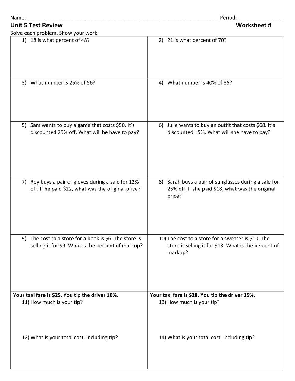 7LRIS Honors WS #26 - Yellow Unit 6 Test Review