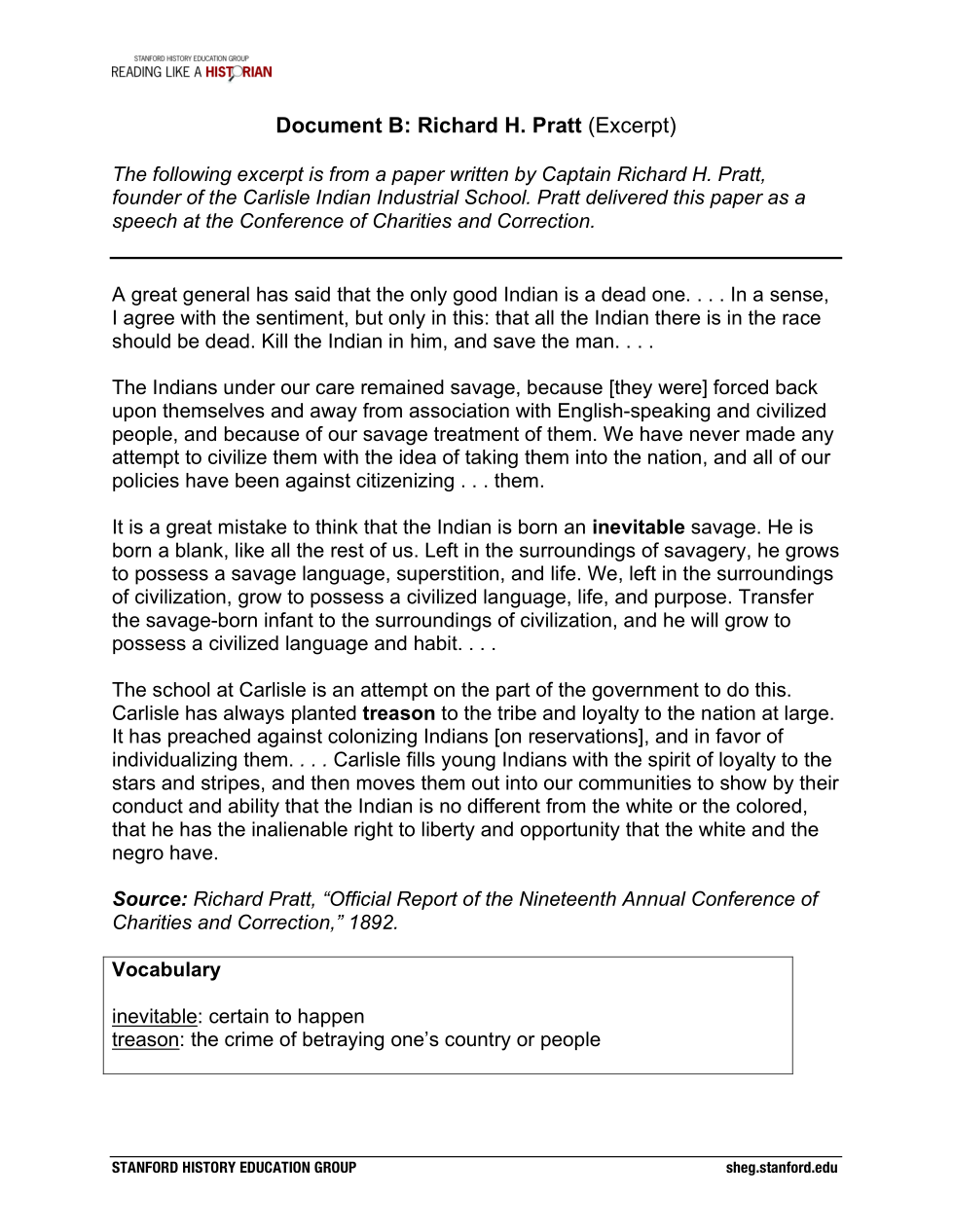 Content Objective: I will be able to determine Richard Pratt’s purpose in founding the Carlisle Indian Industrial School.