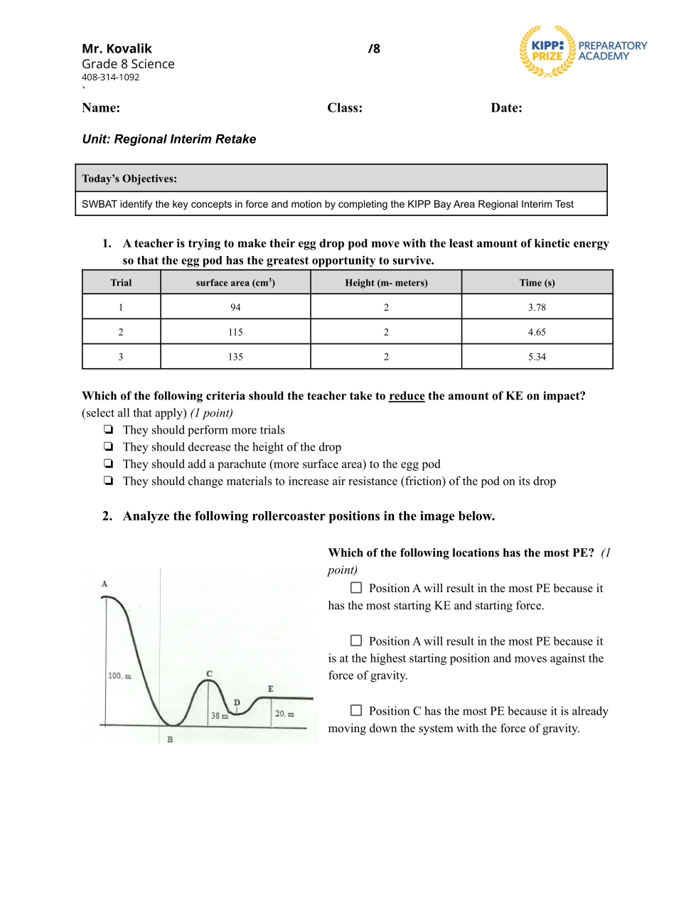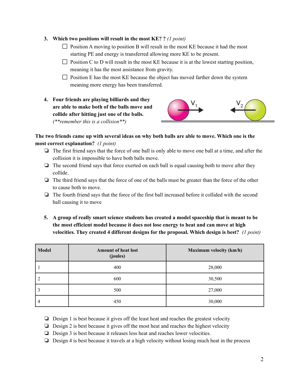 Position E has the most KE because the object has moved farther down the system meaning more energy has been transferred.