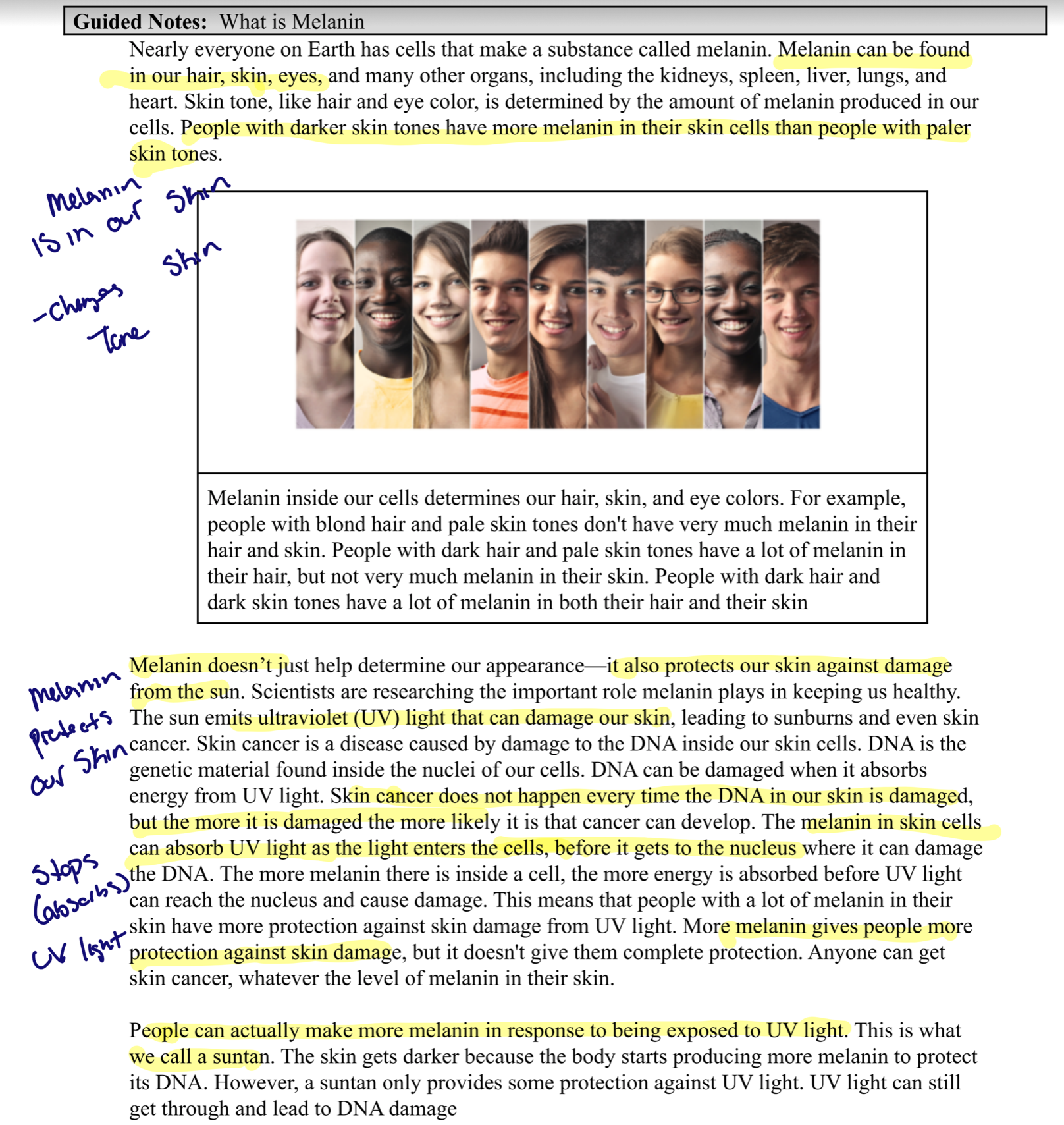 Prompt: How does melanin provide protection against skin cancer?Examine and annotate this screenshot from the Sim, then write an explanation of how this evidence helps answer the question. Use the following words in your explanation:- absorb