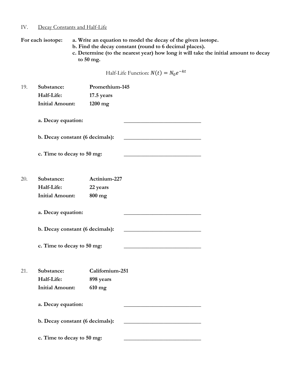 Write a decay equation that models the decay of Promethium-145, with a half-life of 17.5 years and an initial amount of 1200mg.
