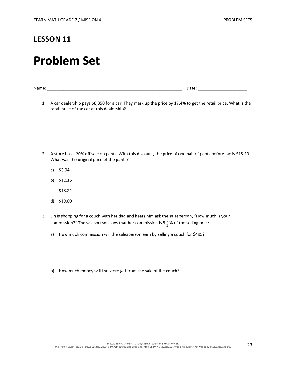 3. Lin is shopping for a couch with her dad and hears him ask the salesperson, "How much is your commission?" The salesperson says that her commission is 5.5% of the selling price.