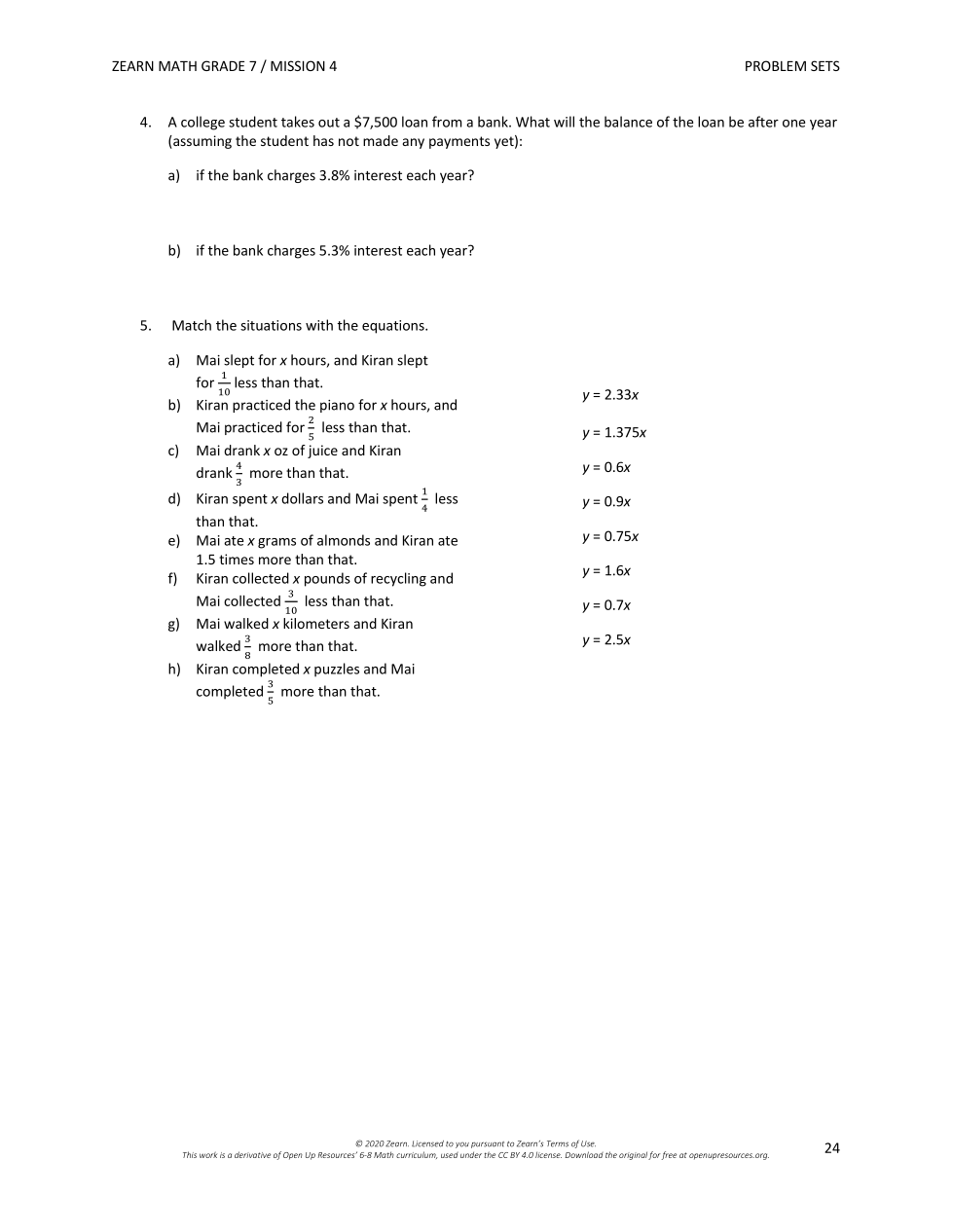 g) Mai walked x kilometers and Kiran walked 3/8 more than that. | arrow_right_alt | y = 1.375x |