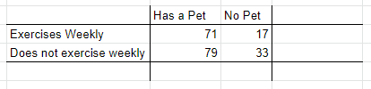 If a person is randomly selected from the group, what is the probability, as a percent, that they don't own pets and don't exercise weekly?