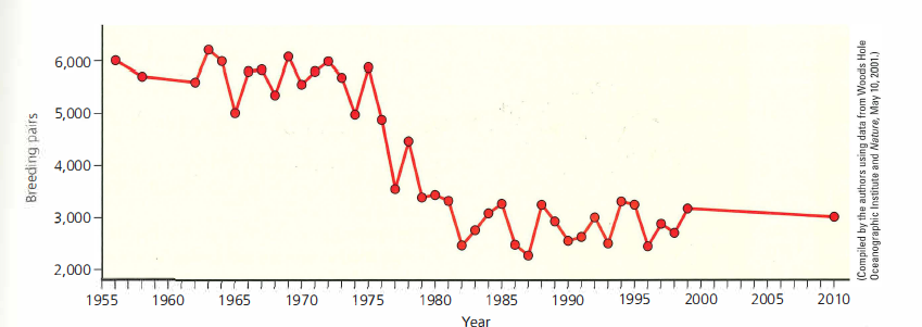 The graph below shows changes in the size of an emperor penguin population in terms of numbers of breeding pairs on the island of Terre Adelie in the Antarctic. Use the graph to answer the questions below.