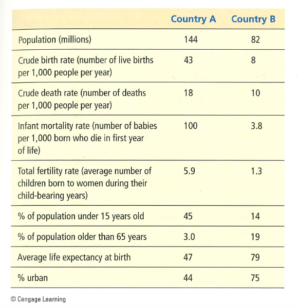 The chart below shows selected population data for two different countries, A and B. Study the chart and answer the questions that follow.