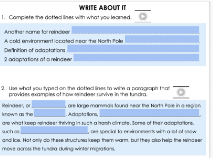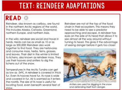Reindeer, or _________________, are large mammals found near the North Pole in a region known as the _______________. Adaptations are what keep the reindeer thriving in such a harsh climate. Some of their adaptations, such as _______________, are special to environments with a lot of snow and ice. Not only do these structures keep them warm, but they also help the reindeer move across the tundra during winter migrations.