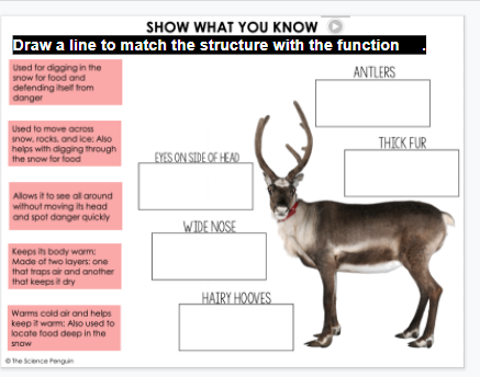 HAIRY HOOVES | arrow_right_alt | USED TO MOVE ACROSS SNOW, ROCKS, AND ICE: ALSO HELPS WITH DIGGING THROUGH THE SNOW FOR FOOD |