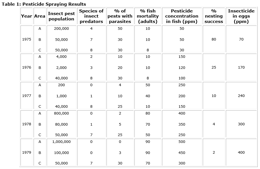 Insect populations were estimated, fish and bird populations studied, soil samples collected, and pesticide concentrations measured in an effort to determine the overall environmental influence of this new pesticide. The results are recorded in Table 1.