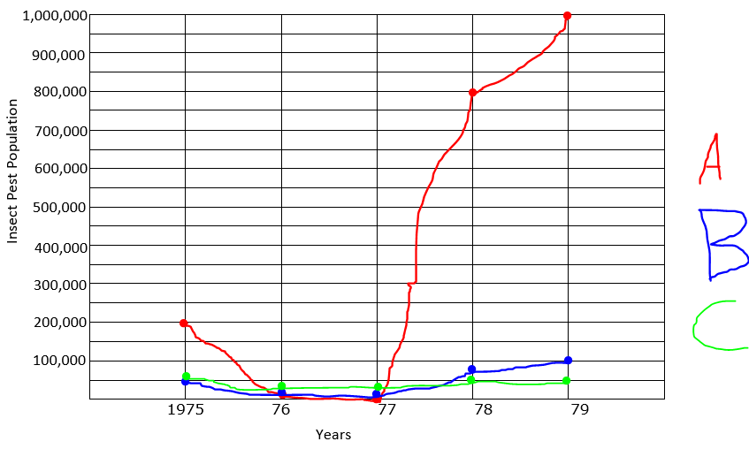 The graph shows the changes over time of the population of insect pests in each area: A, B, and C.