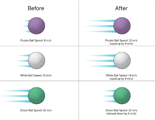 On this image, Find the change in speed and circle it for the golf balls.