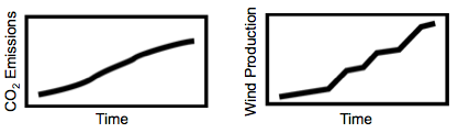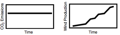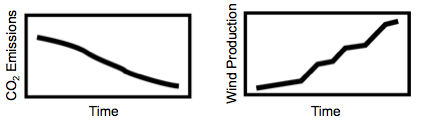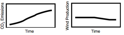 The claim is made that carbon emissions can be reduced by increasing the amount of electricity produced by wind. Which pair of graphs, showing data for CO2 emissions, and wind production of electricity, would support this claim?